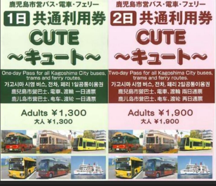 - Pase de viajes ilimitados: Este pase le ofrece viajes ilimitados en el tranvía de la ciudad de Kagoshima, el autobús urbano y el autobús turístico retro «Kagoshima City View», así como el ferry de Sakurajima y el autobús Sakurajima Island View.