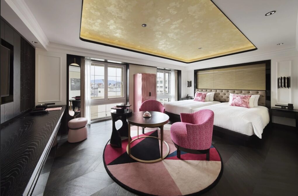 - L’ambiance : Le deuxième hôtel de luxe au monde de la marque gastronomique française « Fauchon ». La caractéristique phare est le « Gourmet Bar »—un placard rose emblématique dans chaque chambre, rempli de macarons, thés et douceurs Fauchon à déguster librement. Le design sophistiqué, décliné en « Rose Fauchon » et noir, est incroyablement photogénique sous tous les angles.