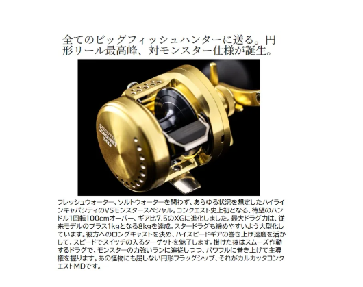 시마노 최고의 라운드 릴인 “캘커타 콘퀘스트”의 몬스터 드라이브(MD) 모델입니다. 거대한 물고기를 제압하는 힘과 아름다운 외관은 성능에 대한 갈증과 소유의 자부심을 동시에 충족시켜 줍니다.